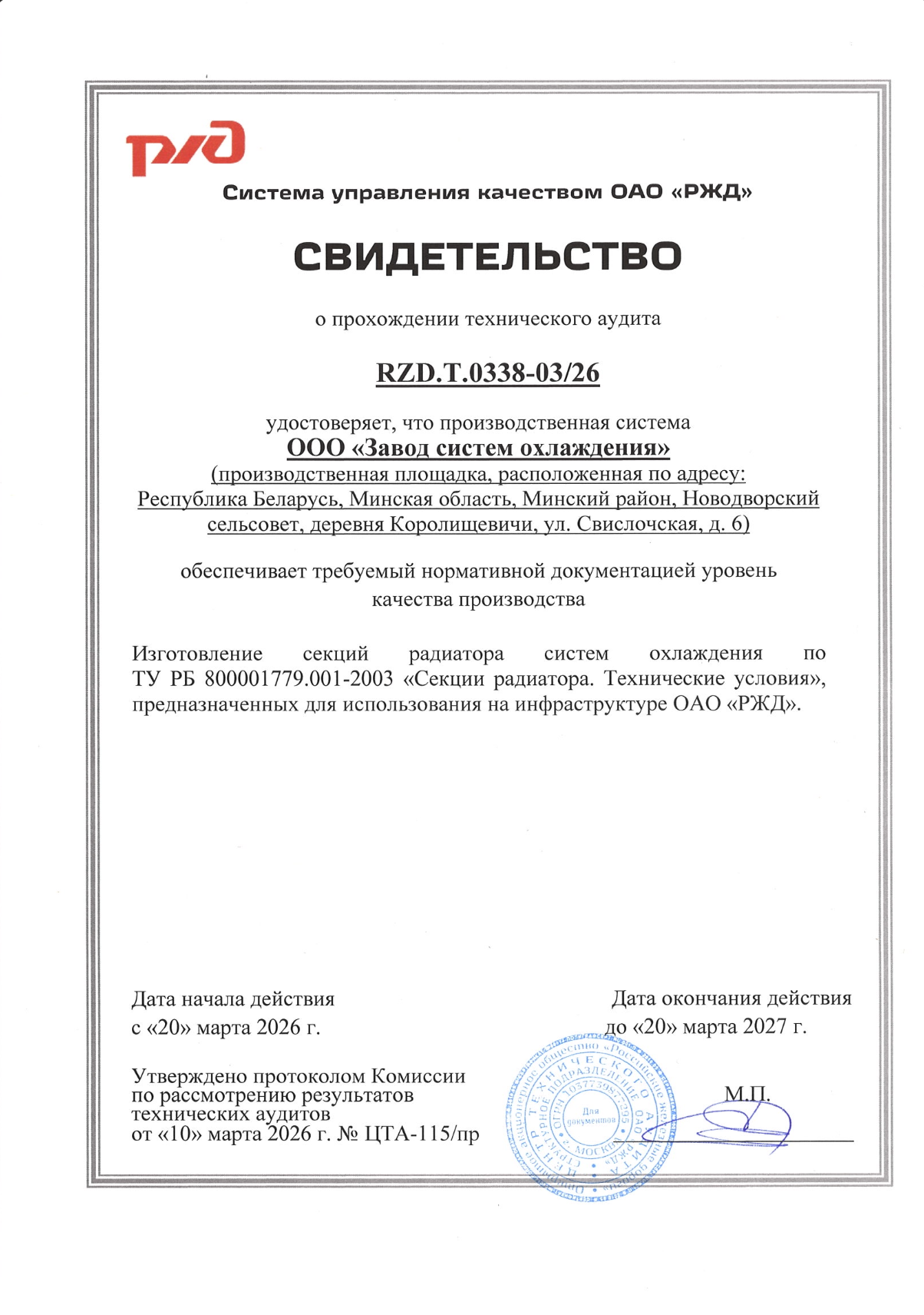 В марте 2026 года предприятие получило свидетельство ЦТА ОАО “РЖД” о прохождении технического аудита №RZD.T.0338-03/26 с областью распространения: изготовление секций радиатора систем охлаждения по ТУ РБ 800001779.001-2003 “Секции радиатора. Технические условия”.